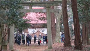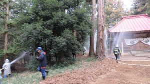 令和5年1月22日(日)桜川市真壁町上谷貝地内の鹿島神社において、桜川市消防団、上谷貝地区自治会、桜川市教育委員会、桜川市役所及び桜川消防署真壁分署合同での文化財防火デー防災訓練が実施されました。 昭和24年1月26日に法隆寺金堂で火災が発生し壁画が焼損したことに基づいて毎年1月26日は「文化財防火デー」と定められています。これを機会に文化財愛護思想の普及と日頃から関係者との連携を密にするなど、地域方々の防火・防災意識の高揚に努めました。