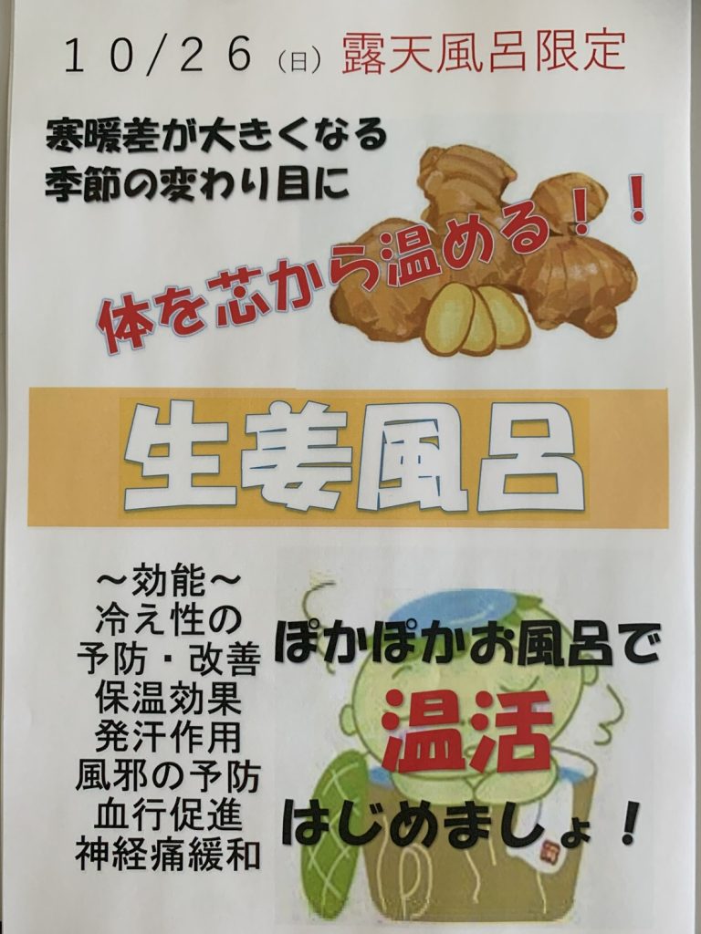 今月26日(日)の「おふろの日」は、露天風呂が「しょうが湯」に変わります。季節の変わり目に体の芯から温めて「温活」しましょう。 当日は、利用ポイントを3倍とさせていただきます。 皆様のご来館をお待ちしております。